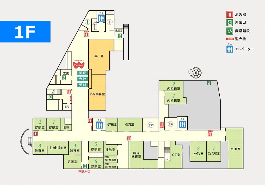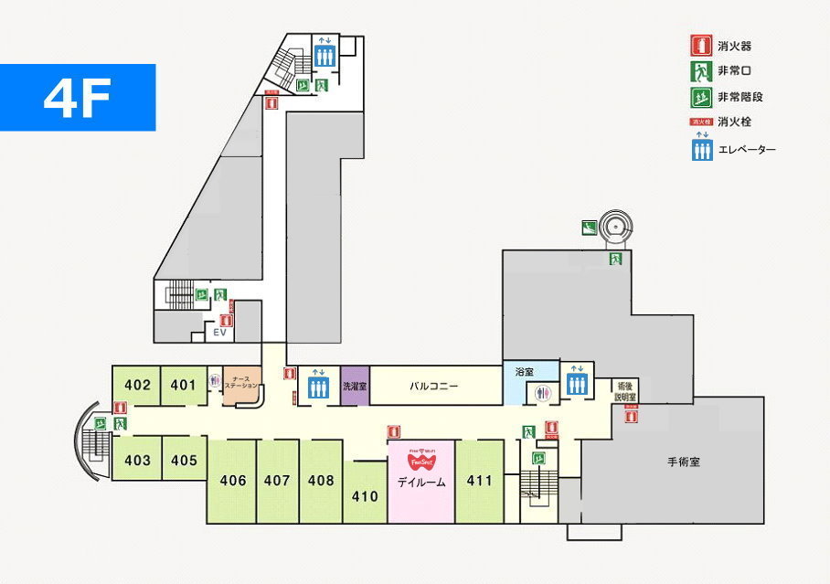フロアマップ ▼1F受付・会計・待合室(自販機あり:Free Spot wifi)・診察室・処置室・点滴室・化学療法室・検査室・健診室・内視鏡室・放射線検査室(レントゲン・X-TV・CT・MRI) ▼2F2階病棟58床(地域包括ケア病床・療養病床)・ナースステーション・テレビ(冷蔵庫)カード販売機・浴室・リハビリテーション室・デイルーム(自販機あり) ▼3F3階病棟47床(一般病棟)・観察室・ナースステーション・浴室・入退院支援室・通所リハビリテーション室・デイルーム(自販機あり)・洗濯室 ▼4F4階病棟13床(一般病棟)・ナースステーション・手術室(第1手術室・第2手術室)・浴室・デイルーム(自販機あり:Free Spot wifi)・洗濯室・バルコニー